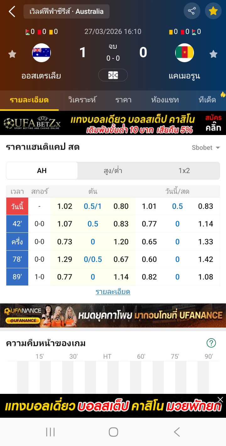 27 มี.ค. 2026,16:10 ออสเตรเลีย VS แคเมอรูน ต่ำกว่า 2.25⭕ได้เต็ม1-0