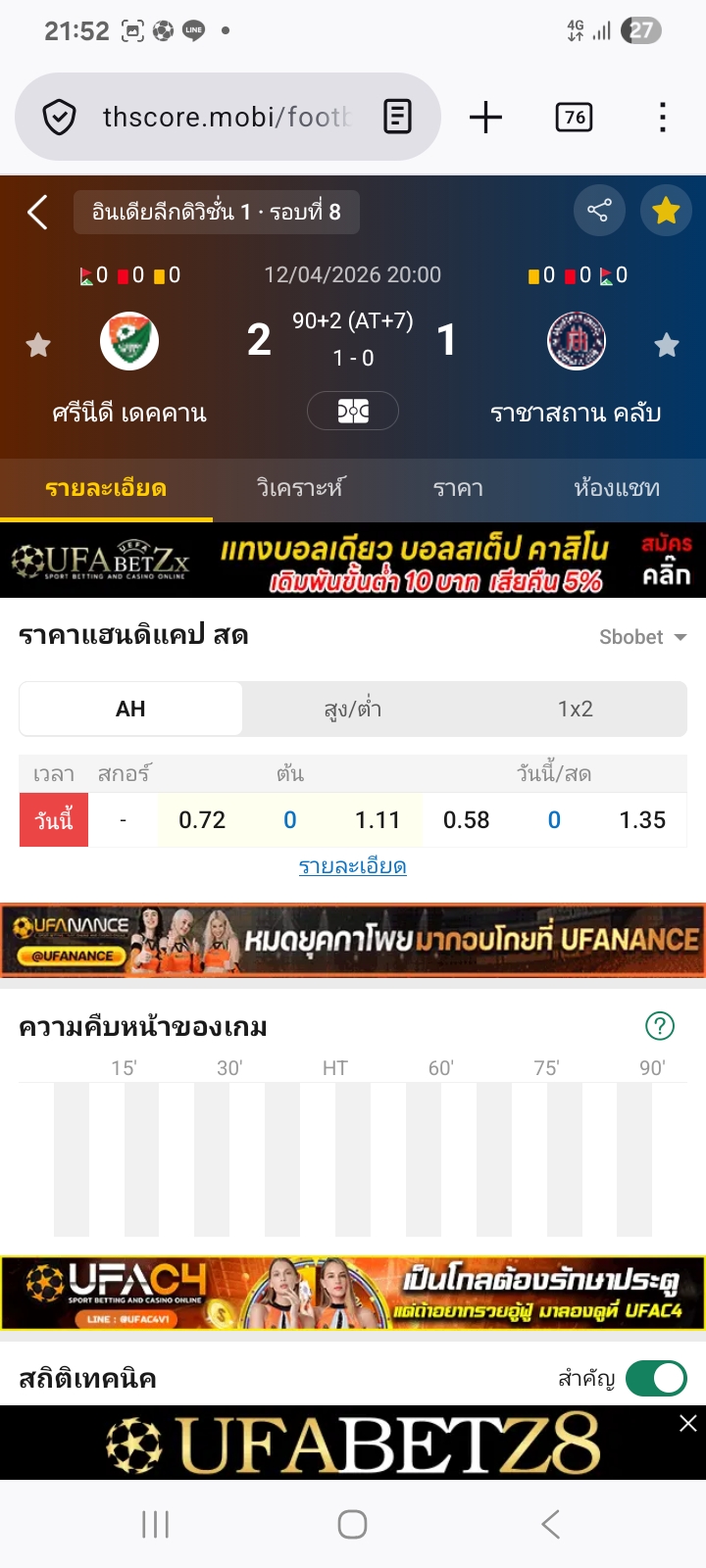 12 เม.ย. 2026,20:00 ศรีนีดี เดคคาน VS ราชาสถาน คลับ สูงกว่า 2.5⭕ได้เต็ม2-1