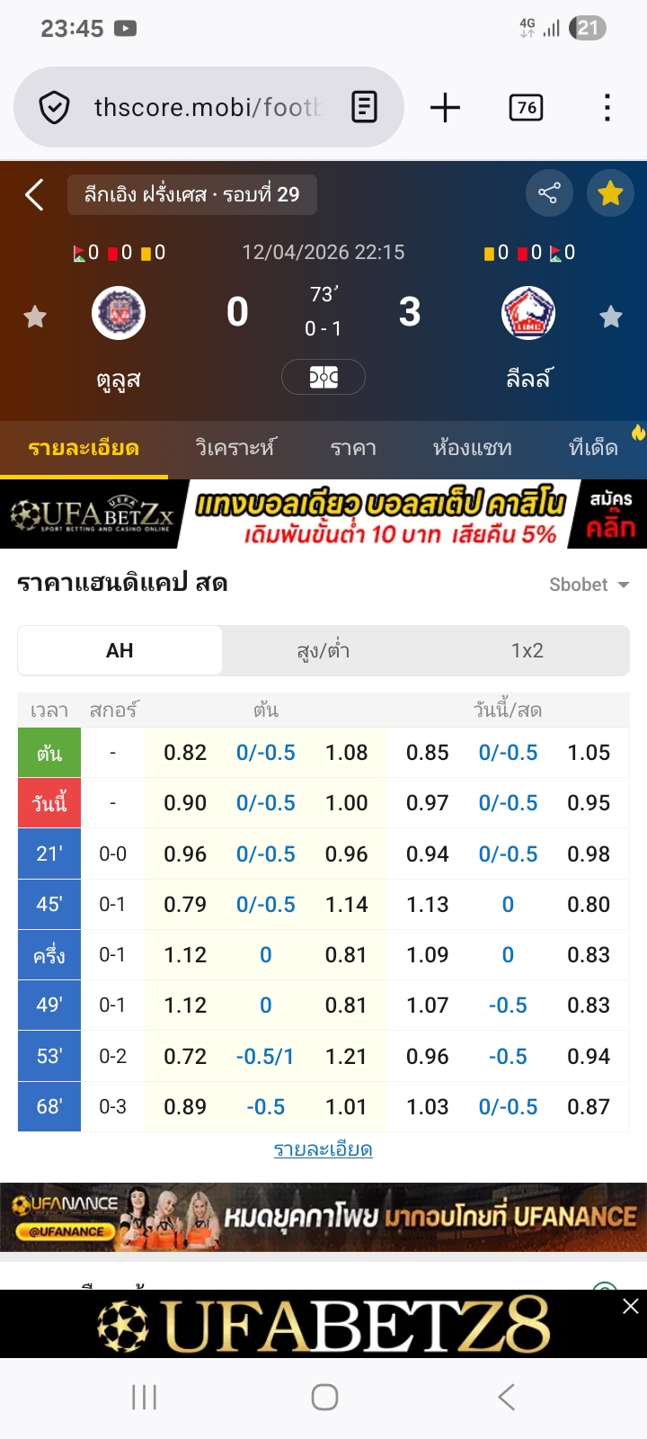 12 เม.ย. 2026,22:15 ตูลูส VS ลีลล์ ต่อทีมเยือน 0.25⭕ได้เต็ม(ยังไม่จบแต่มั่นใจว่าแดก)