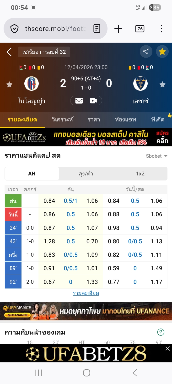 12 เม.ย. 2026,23:00 โบโลญญ่า VS เลชเช่ ต่อเจ้าบ้าน 0.5⭕ได้เต็ม2-0