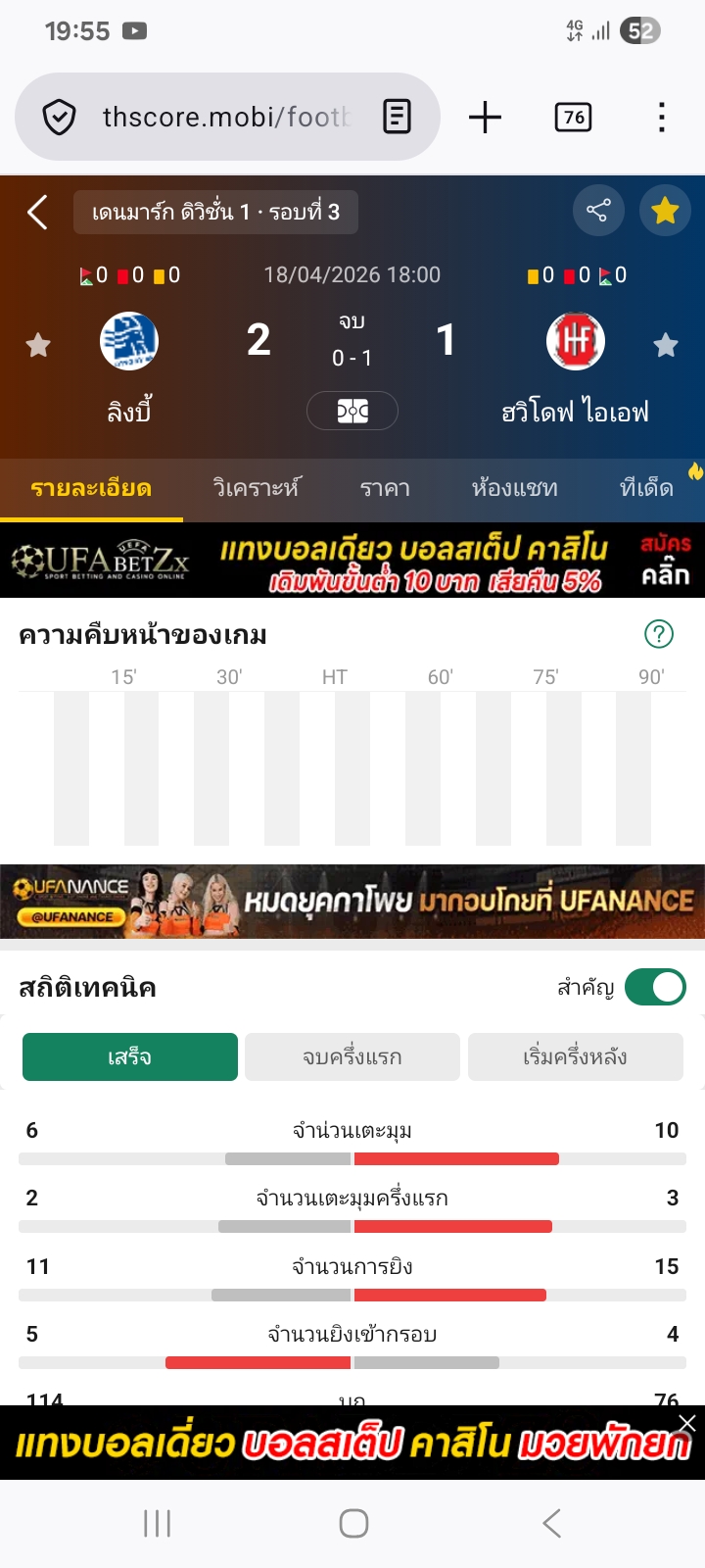 18 เม.ย. 2026,18:00 ลิงบี้ VS ฮวิโดฟ ไอเอฟ ต่อเจ้าบ้านครึ่งลูก⭕ได้เต็ม ( ดูรูป )
